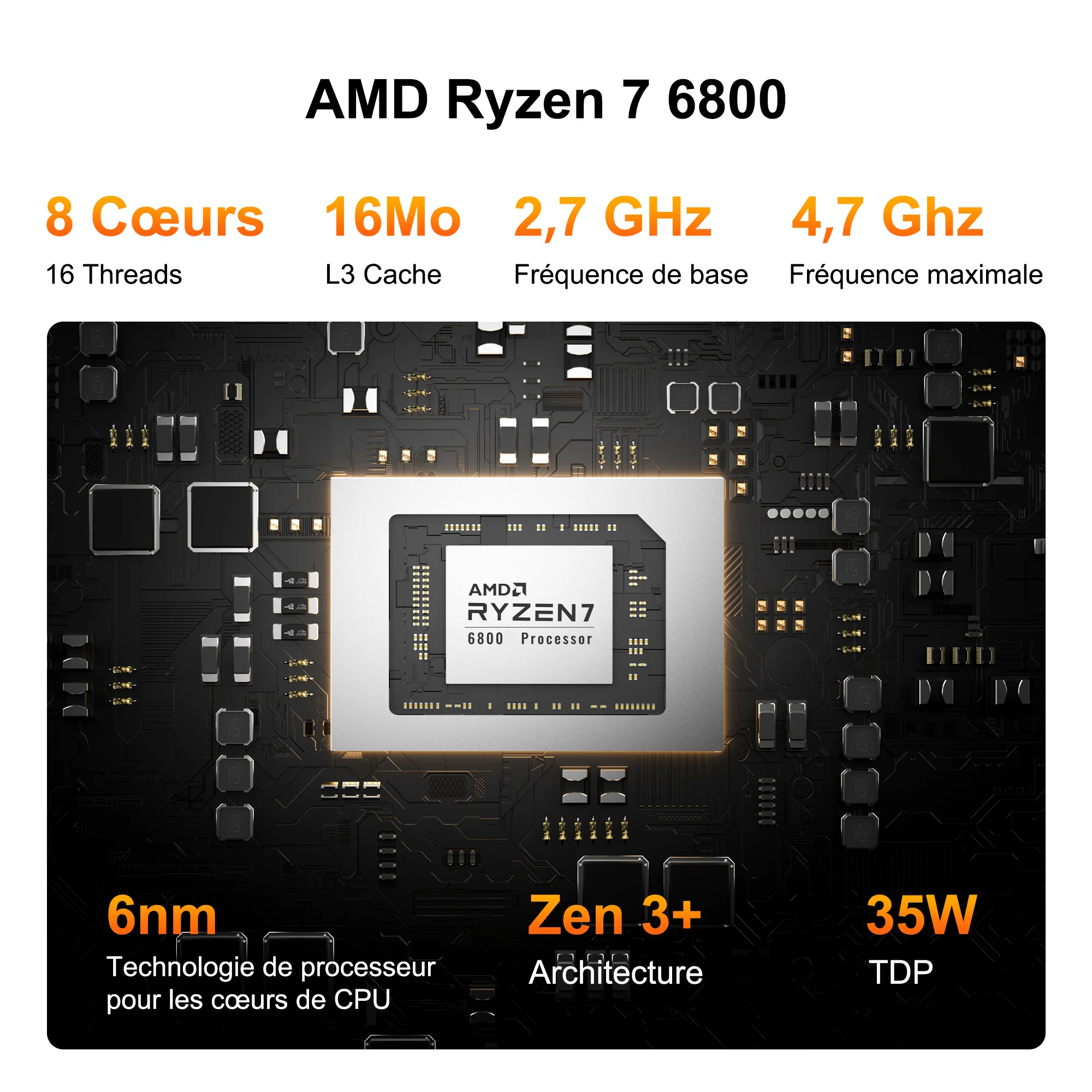 - AMD R7-6800 | Graphiques Radeon™ 680M – Puissance fluide pour multitâche, création 4K et gaming léger sans GPU dédié.