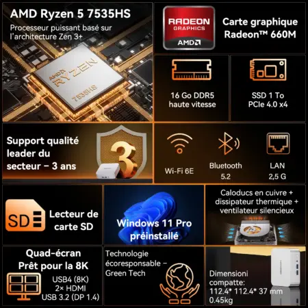 - 🏆 Lauréat du European Hardware Award – Meilleur Mini PC milieu de gamme.