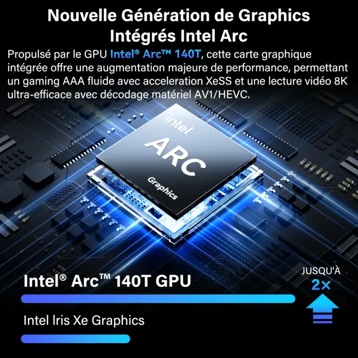 - Graphiques Intel® Arc™ A140T — Ray Tracing et XeSS, idéal pour gaming 1080p, édition multimédia et contenu 4K.