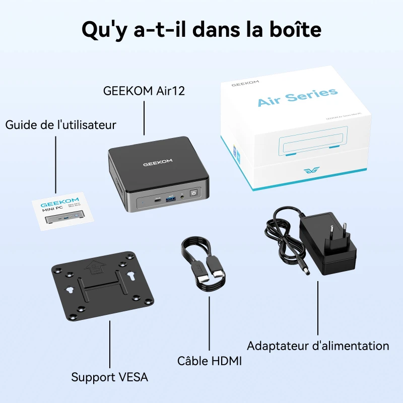 | Contenu de la boîte | 1 x GEEKOM Air12 1 x Adaptateur secteur 1 x Câble HDMI 1 x Guide d'utilisation 1 x Support VESA |