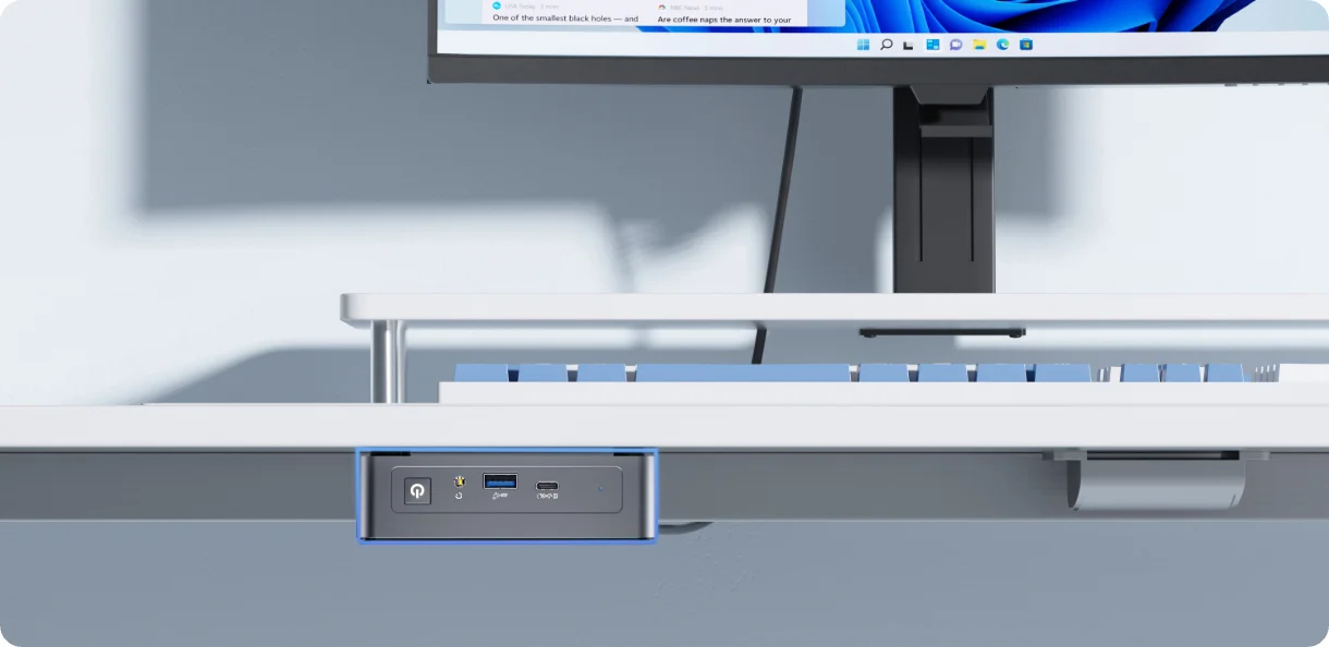 - Châssis industriel & connectivité pro – Un boîtier en alliage d’aluminium usiné CNC, intégrant Wi-Fi 7, Bluetooth 5.4, double Ethernet 2,5G et lecteur d’empreinte digitale, alliant robustesse et connectivité haut de gamme.