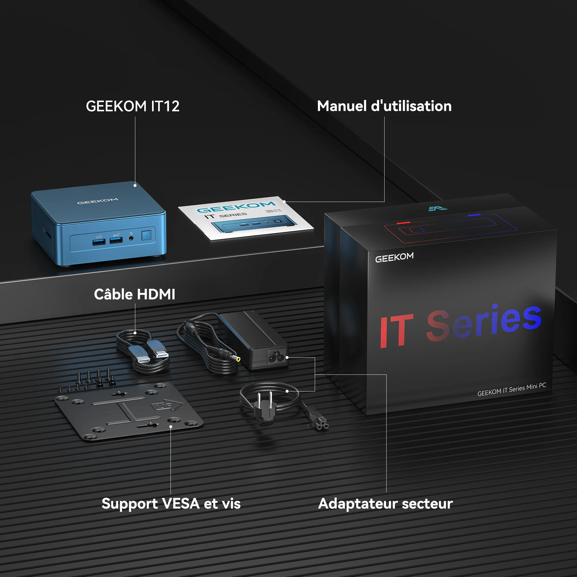 | Contenu de la boîte | 1 x GEEKOM IT12 1 x Manuel d'utilisation 1 x Câble HDMI 1 x Adaptateur secteur 1 x Support VESA et vis |